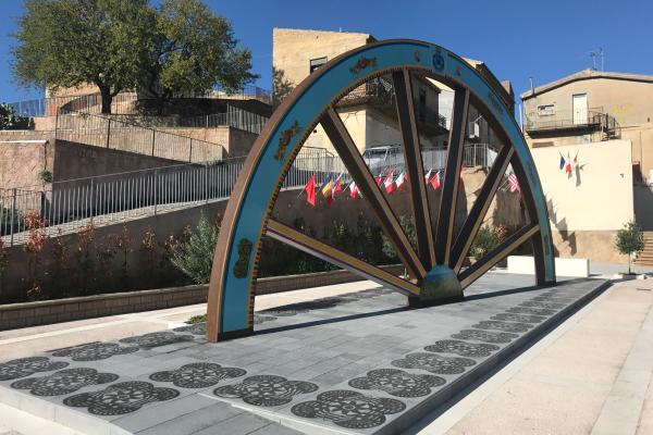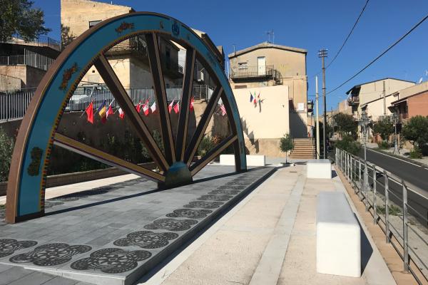 In un’area in cui era presente un vecchio mulino è stata realizzata una ruota artistica che rappresenta il fulcro della composizione, ovvero il “monumento” del luogo, collocato in posizione baricentrica all’interno della piazza. Pavimentazione decorata, illuminazione a led ed elementi di arredo urbano.