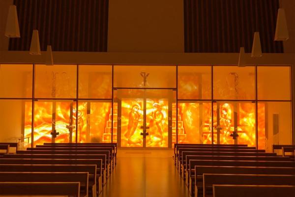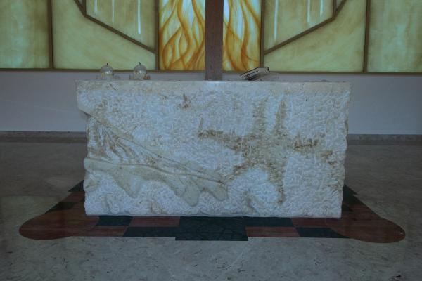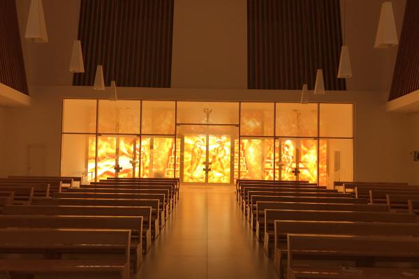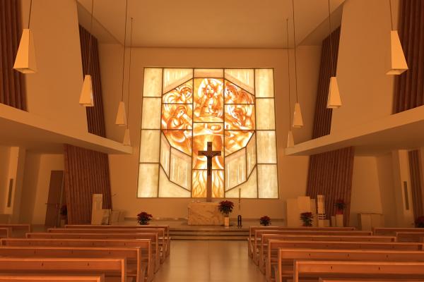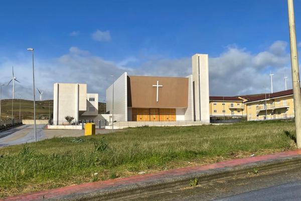 La Chiesa, nel voler rappresentare un segno semplice ma al contempo chiaro e autorevole, prende forma attraverso due setti laterali conferendole solidità e verticalità, racchiude al suo interno un blocco unico; L’ingresso rappresenta, in un’unica soluzione, maestosità e accoglienza.
